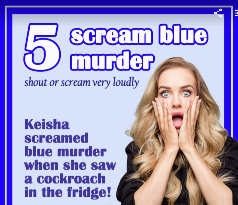 'Blue murder' 직역해 보면 '파란 살인'인데요. 이 단어는 프랑스의 'Morbleu' 의곡에서 나왔다고 하는데요. 살일은 목격한 사람의 입장에서 놀란서 소리치는 모습에서 유래가 되었다고 합니다. 뜻을 보면 '소스라치게 놀란' 정도일것 같네요 ^.^ 그래서 scream blue murder의 뜻은 '소스라치게 놀라 소리치다' 정도 일것 같습니다.