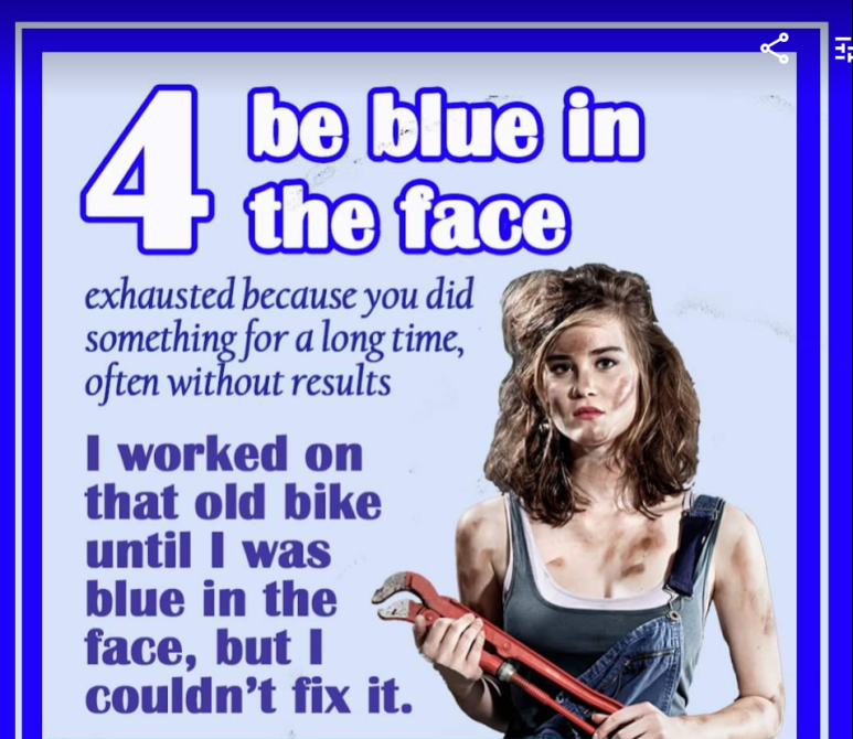 'be blue in the face'는 우리말로 번역을 하면' 지치다'라는 말이 정확할것 같습니다. 이 말은 사람이 숨을 잘 못쉴때 얼굴이 파랗게 질리게 되잖아요? ^.^ 거기서 유래를 했고. 어떤일에 굉장한 노력을 했는데도. 성공하지 못한 상황에 사용이 됩니다.