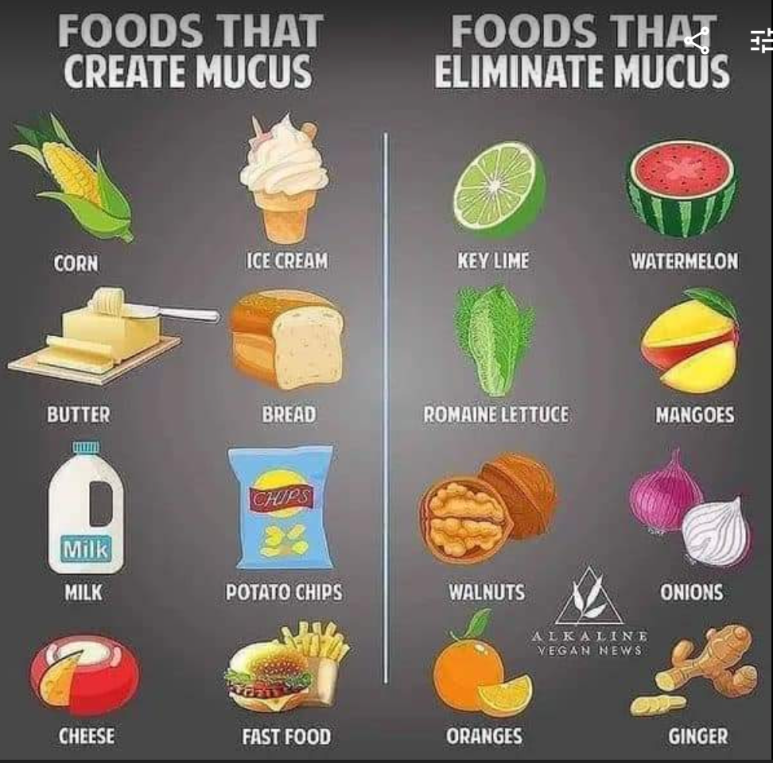 위의 그림에서 왼쪽은 'Mucus(점액)'을 증가 시키는 음식이고 오른쪽은 점액을 줄여주는 음식이라고 합니다.