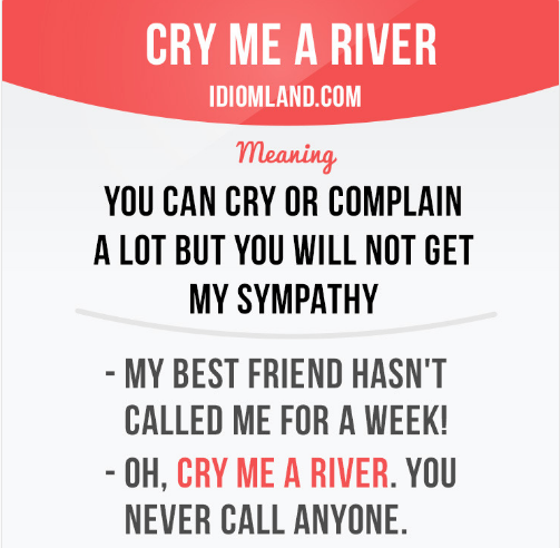 그 기원은 1953년에 발매된 Arthur Hamilton이 작곡한 곡이 히트를 치면서 관용어구로 쓰이기 시작했다고 합니다. 그리고 2012년인가 인기 가수 였던 저스틴 팀버레이크가 당시 헐리드우 스타였던 브리트니 스피어스와 헤어지고 나서 비꼬는 느낌으로 발매한 곡 이름도 'Cry me a river'였습니다.