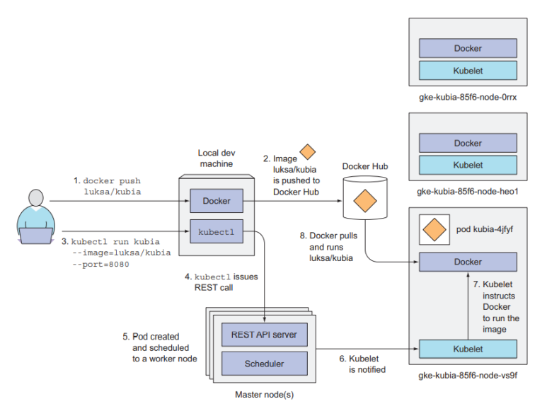 그럼 이제 이런 배포 과정이 어떻게 진행이 되는지 그림을 통해 알아 봅시다. kubectl 명령어로 컨테이너를 실행을 시키면 그 절차는 아래 그림과 같은 과정을 거치게 됩니다.