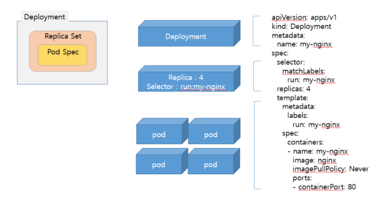 그림에서 보듯이 Deployment 안에는 Replicaset과 Pod객체를 포함을 하고 있습니다. 위의 그림은 Replicaset은 4개의 Pod로 유지하고 Level값은 my-nginx로 대상 Pod를 정의 하고 있고 Container부분에서 세부 Spec을 정의를 하고 있습니다.