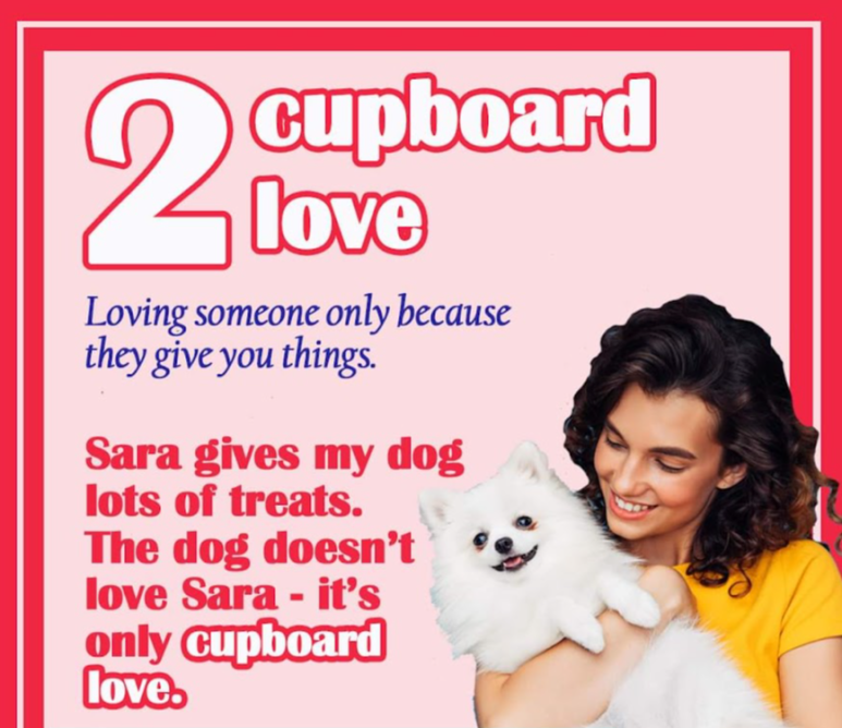 cupboard love(컵 보드 러브): 그대로 해석을 하면 '찬장 사랑'인데요. 누가 나에게 배풀어 줄때만 사랑하는 것 입니다. 애완동물의 간식이 보통 찬장에 있고, 애완동물이 주인에게 먹이를 얻으려고 애교를 부리는 상황으로 보면 될것 같습니다. 한국어로 적당한 단어가 떠오르지 않네요 ^.^