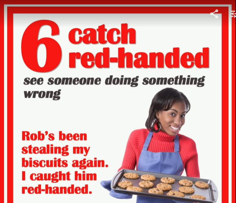 catch red-handed: '현행범을 잡다?'라는 의미로 사용이 되는데요. catch는 잡다 라는 동사이구요. red-handed는 빨간손, 즉 피묻은 손을 의미를 합니다. 그래서 살인자가 현장에서 손에 피를 묻힌채로 잡힐때를 의미를 하고 현장 체포 되다라는 의미로 사용이 됩니다.