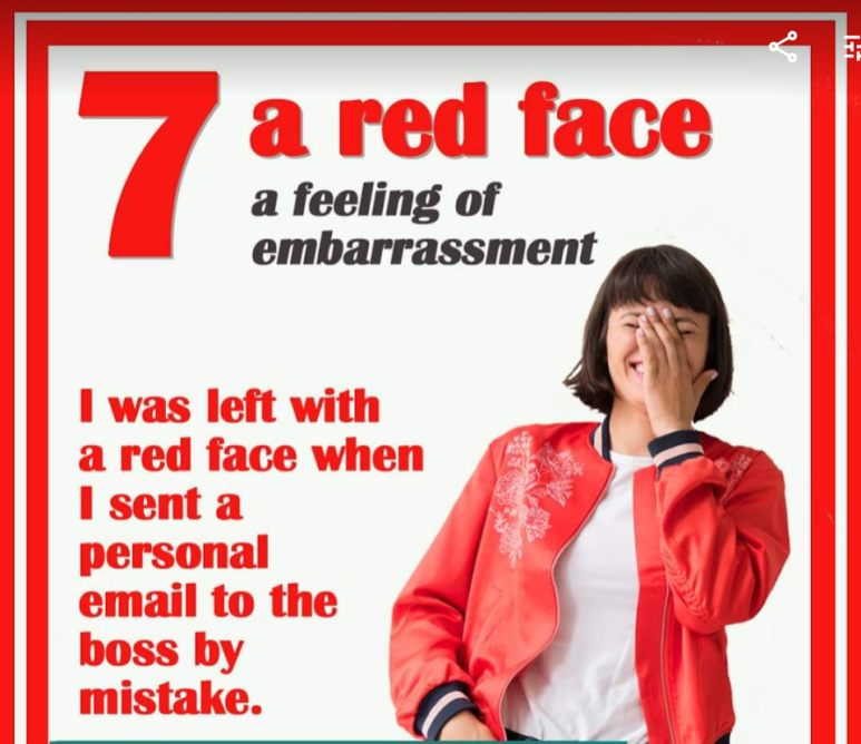 a red face: '부끄러운'을 의미를 합니다. 보통 사람이 부끄러울때에는 얼굴이 빨간빛으로 변하는 것에서 유래 되었다고 하네요 ^.^
