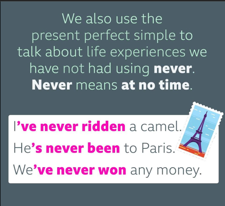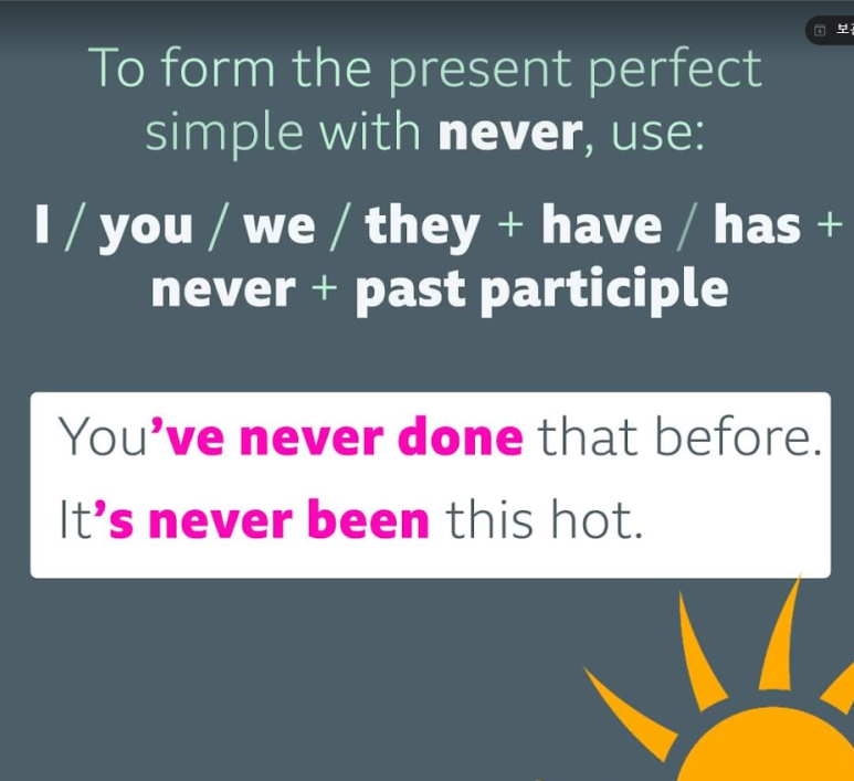 그리고 단순 현재 완료는 Never라는 단어와 함께 사용이 되어서 과거로 부터 지금까지 어떤걸 해보지 않았을 때를 표현을 할때에도 사용이 되는데요 ^.^