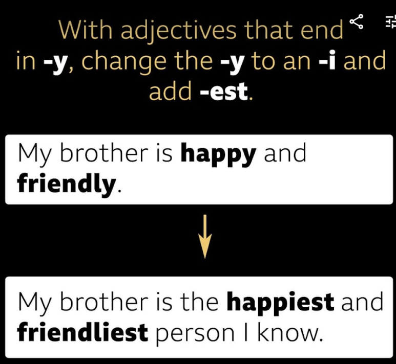 그리고 형용사 중에 y로 끝나는 형용사는 y를 i로 바꾼 다음에 est를 붙여 주면 됩니다.
