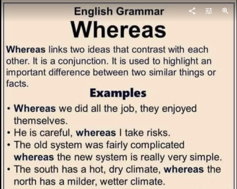 whereas는 두개의 문장을 이어 주는 접속사로 사용이 되는데요. 앞과 뒤의 문장의 뜻이 차이가