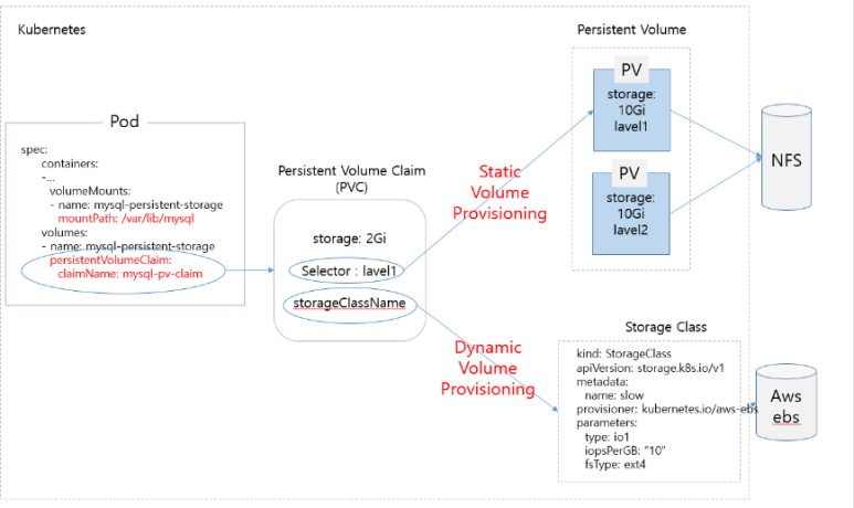 스토리지를 매핑시킨 PersistentVolume(PV)와 그 PV를 Pod에서 사용할때 PV로 Volume내역을 요청하는 PersistentVolumeClaim(PVC) 2단계로 분리되어 있습니다.