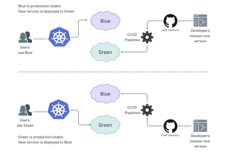 Blue/green deployment: Blue is the existing version and Green is the new version with new functions. After testing the Green version in the production environment with both versions present in the production environment, if there is no problem, the traffic connected to Green is transferred to Green It is a strategy to change and deploy. The advantage is that the deployed version (Green) can quickly switch traffic to Blue if there is a problem, while the disadvantage is that it takes twice as many resources for deployment and handling of stateful applications. The downside is that it's difficult to do.