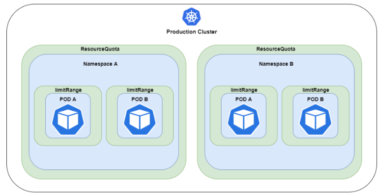 If you look at resourcequota and limitrange as a picture, it is as above. This LimitRange operates with the limit value of all Pods in the cluster (namespace). Let's take a look at the sample limitrange yaml.