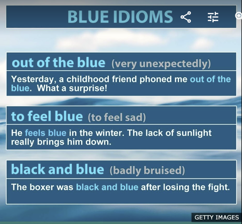 2. to feel blue: '슬프다'라는 의미로 사용이 됩니다, 이 관용어구는 1700년에 발간된 “A Classical Dictionary of the Vulgar Tongue,” 에서 처음 사용이 되었다고 합니다.