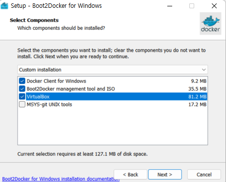 5. It asks for additional installers, the important thing here is that, as mentioned earlier, Docker runs on Linux OS. Check the checkbox of the program called Virtualbox (a tool that provides virtual system provided by Oracle) and click Next.