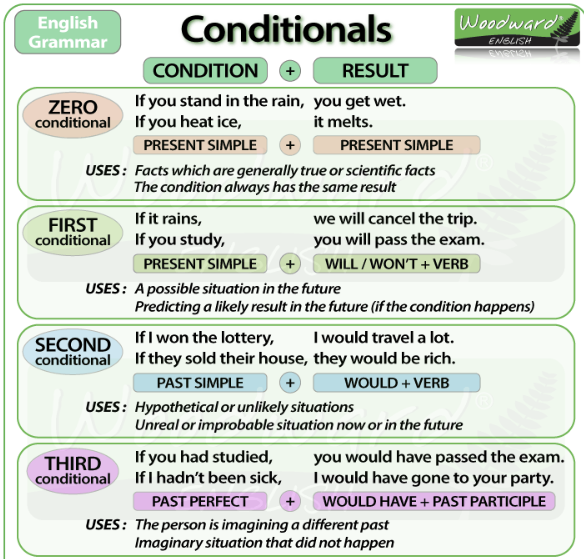 세 번째 조건문에서 우리는 말할 때 보통 have와 had not의 짧은 형태를 사용합니다: I had = I'd, I had not = I didn't. 우리는 또한 will과 will not의 짧은 형태를 사용합니다. I would = I'd, he will = he'd, I would not = I would not .