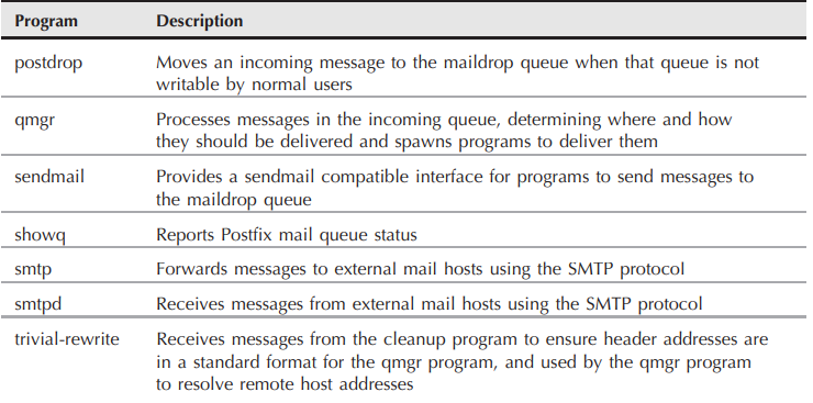 The main launcher is sendmail. It typically runs in background mode, listens for SMTP connections from remote mail servers, and forwards outbound messages from: