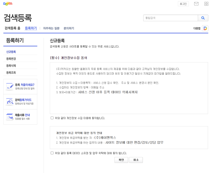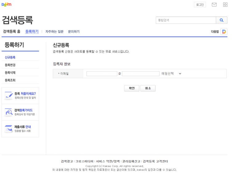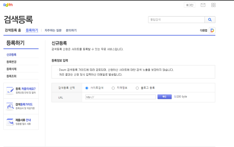 우선 등록을 위해서는 다음 검색 등록 사이트에 접속을 해야 되구요. 접속 주소는 아래와 같습니다.