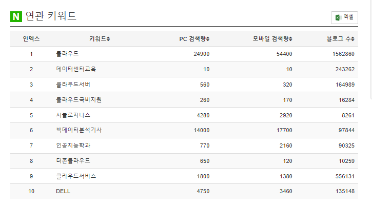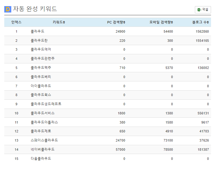 N 자동 키워드도 표시가 되고, 옆에 조회사가 표시가 되는데,, 해당 단어로 네이버에서 검색된 횟수를 표시를 해줍니다.