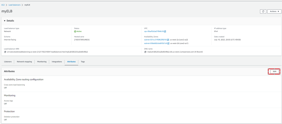생성한 로드 발란서를 클릭을 하고 attribute tab에서 edit 버튼을 클릭 합니다.
