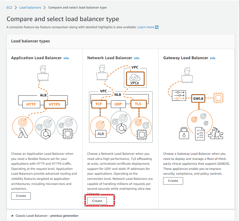 아래 그림 처럼 Load Balancer의 Type중 Network Load Balancer 밑의 Create 버튼을 클릭 합니다.