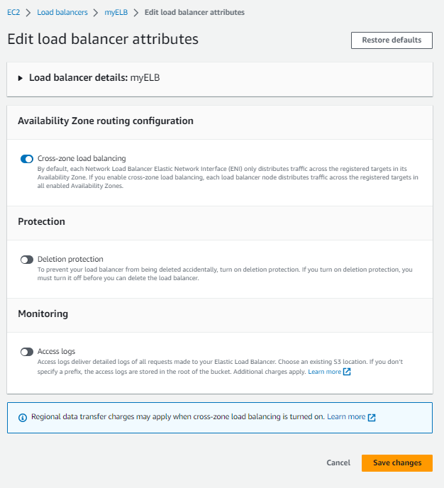 위의 그림 처럼 cross-zoneload balancing을 enable을 클릭 하고, Save changes를 클릭 합니다.