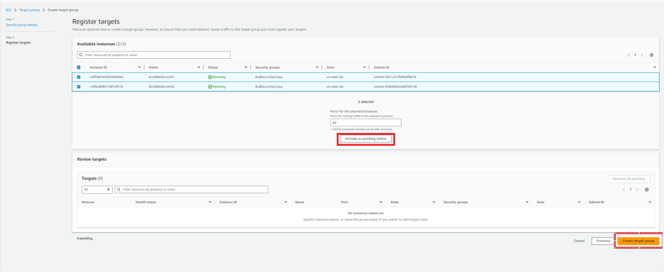 target group에 포함시킬 EC2 Instance 2개를 선택을 하고 include as pending now버튼을 클릭 합니다.