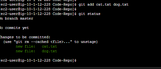 13. Use the command below to stage the two created files and check their status.