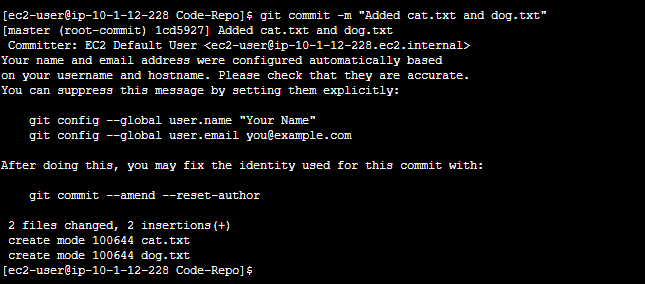 You should see a message in the output that the committer's name and email address have been automatically configured.In production, use the listed commands to set your name and email address, which will then apply to each commit you make. The output also shows two files changed and inserted:
