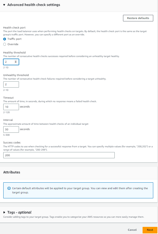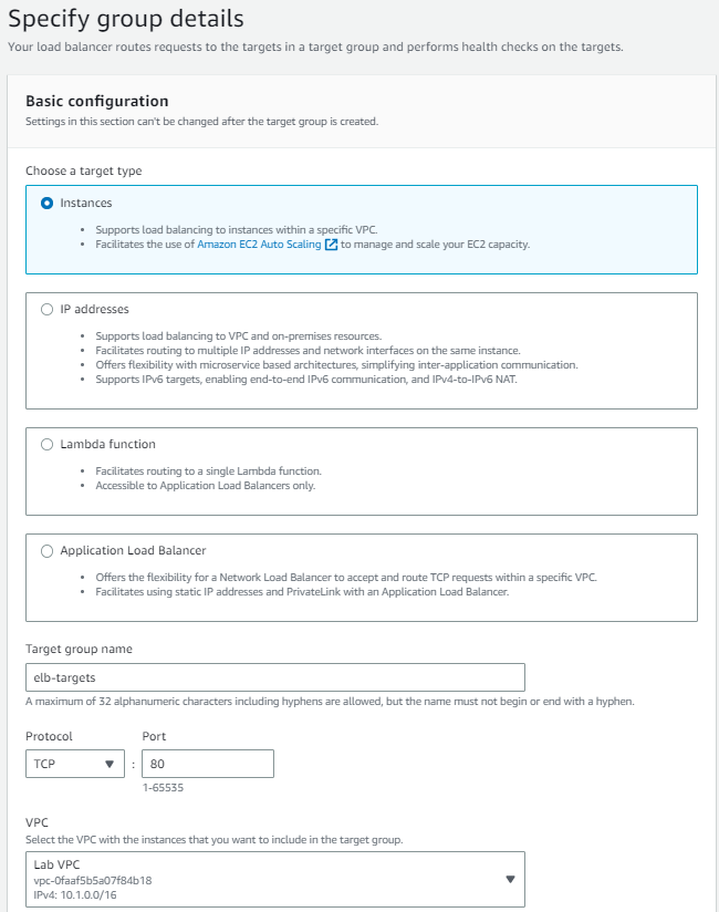 In this exercise, since the target group (where NLB will distribute service requests) is EC2, select Instances for Target group Type, enter the desired name for target group name, select 80 for TCP Port for Protocol,