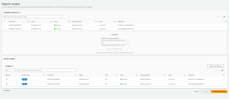 Select 2 EC2 Instances to include in the target group and click the include as pending now button.