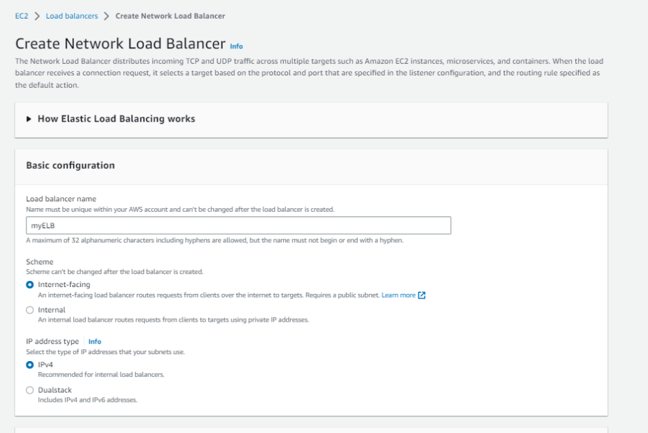 As shown in the figure below, the Load Balancer Name is given the name you want to give, and it is an NLB located in the public subnet.