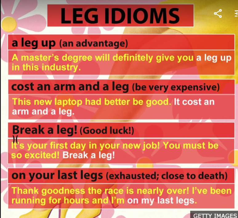 안녕하세요 ^.^ 좋은 아침 입니다. 오늘 포스팅에서는 다리(Leg)와 관련된 관용어구를 포스팅해 보려고 합니다.