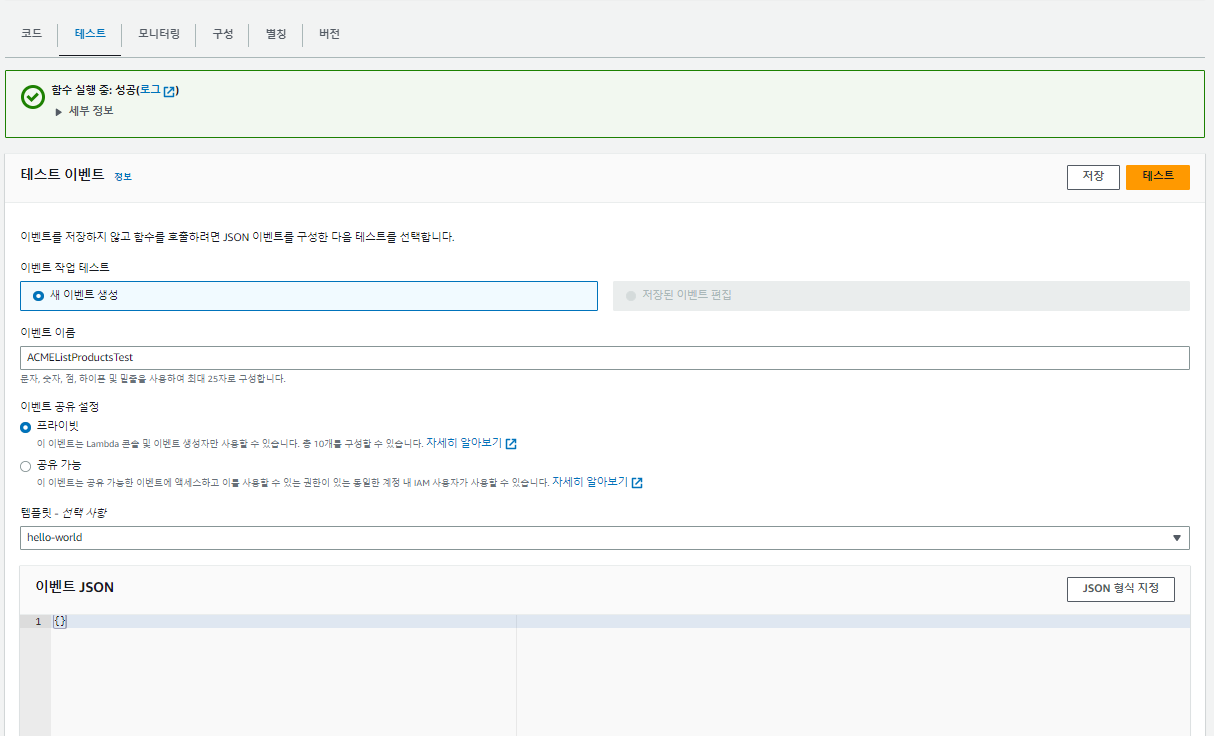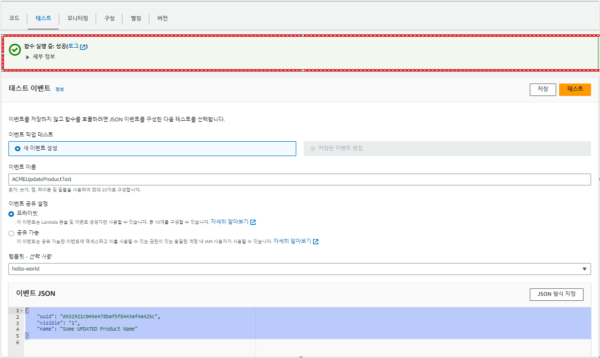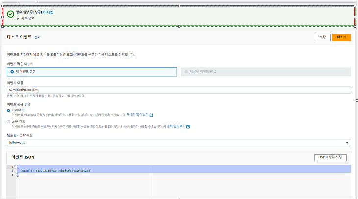 다른 메소드들의 테스트는 앞서 API의 LAMDA 생성시 사용한 테스트 코드를 입력 후 테스트를 진행 하면 됩니다.