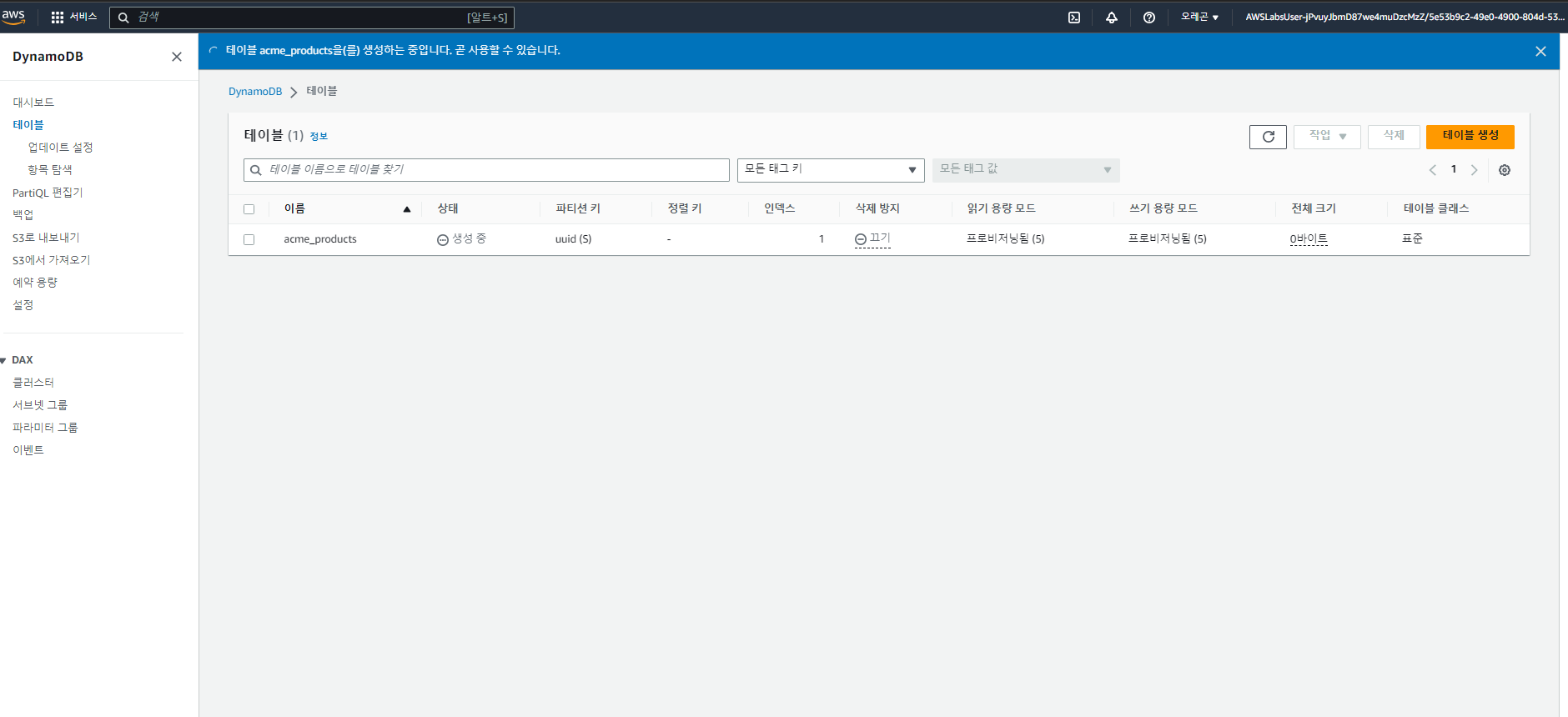 이제 아래 그림과 같이 DynamoDB 테이블이 생성이 되었습니다.