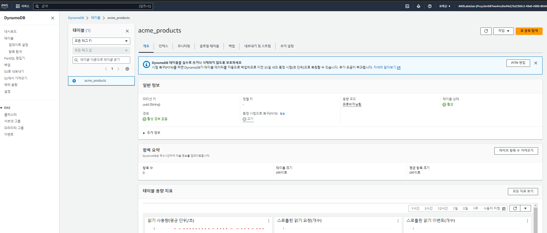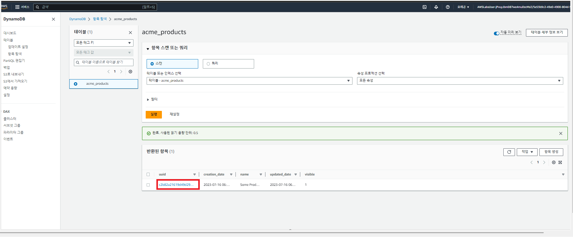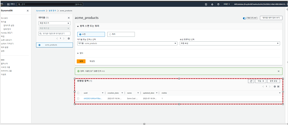 이제 AWS 콘솔창에서 DynamoDB를 검색 후 왼쪽 메뉴의 테이블을 클릭하고 앞서 생성한 acme_products table을 클릭 하고 표 항목 탐색 버튼을 클릭 합니다.