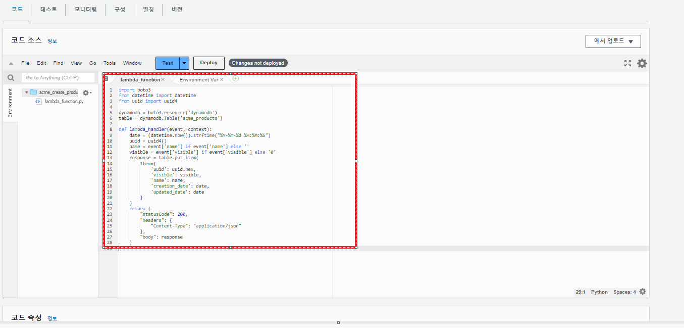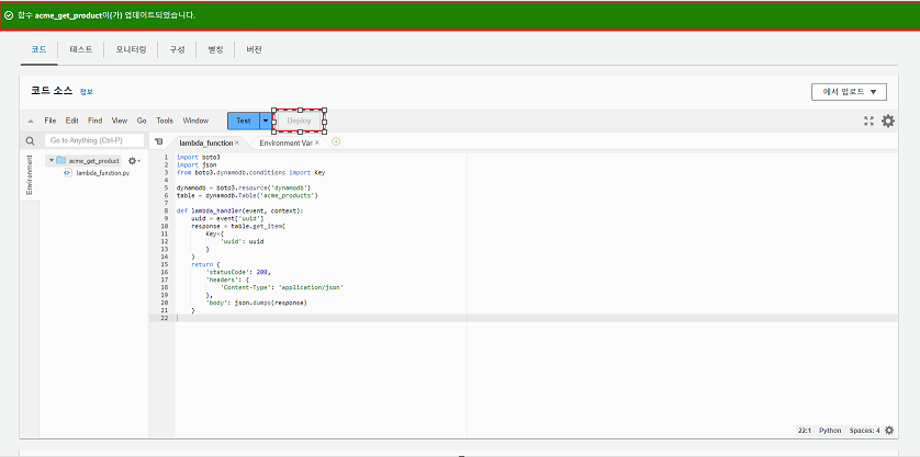 이제 앞에서 생성중이던 Lamda 함수로 돌아가서 코드 부분에 아래의 코드를 아래와 같이 붙여 넣고 Deploy버튼을 클릭 합니다.