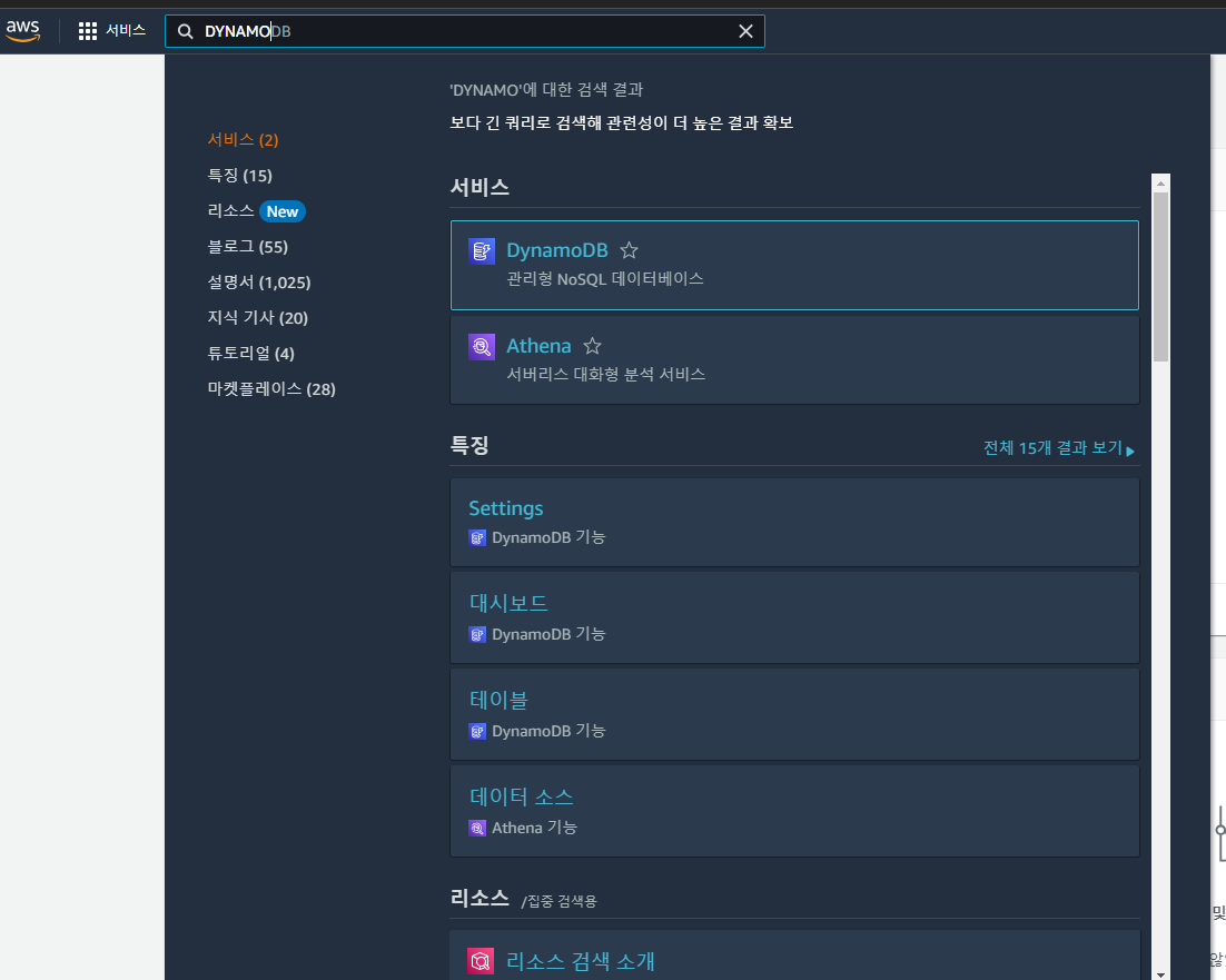 우선 아래와 AWS에 서비스 콘솔에서 DynamoDB를 검색 하고 클릭 합니다.