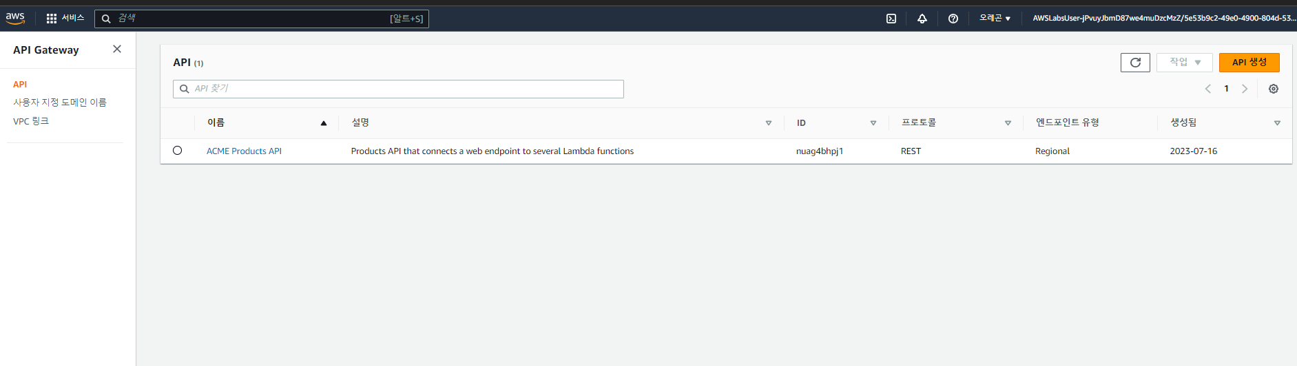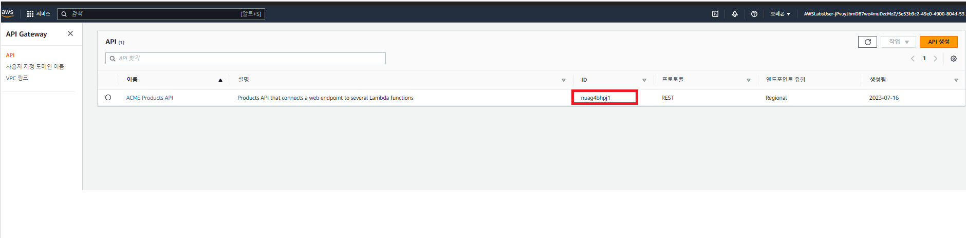 이 함수는 API Gateway에 대한 액세스 권한을 부여 또는 차단하는 정책을 반환하므로 계속 진행하려면 추가 설정이 필요 합니다. AWS 콘솔창에서 API를 클릭 후 생성 하였던 API에서 아래 값을 복사해 둡니다.