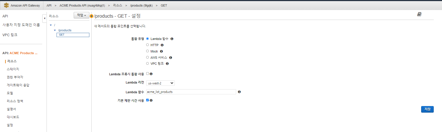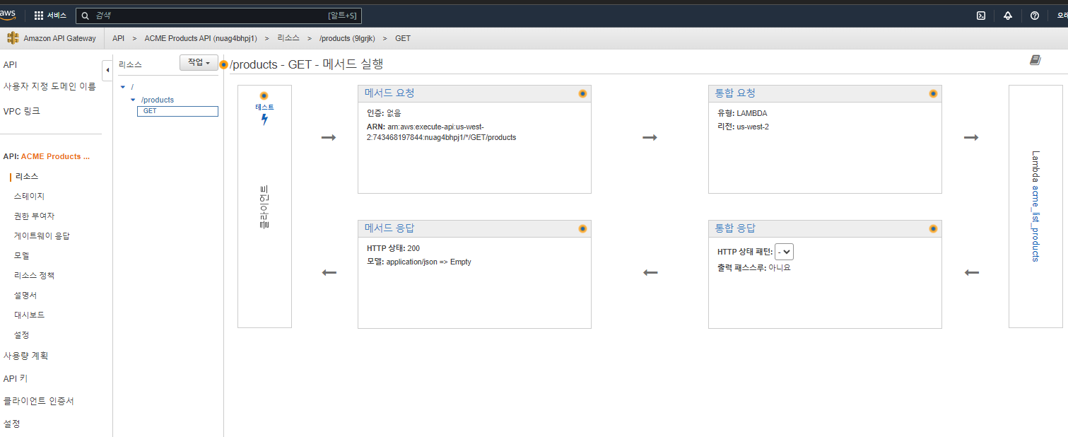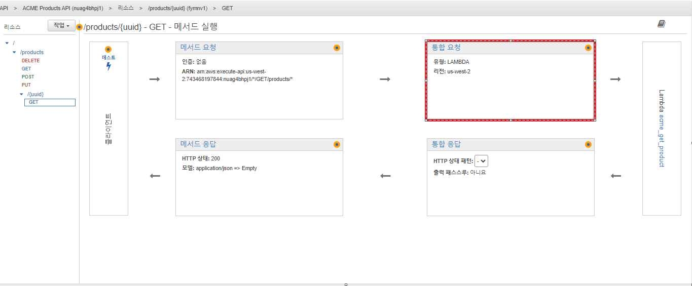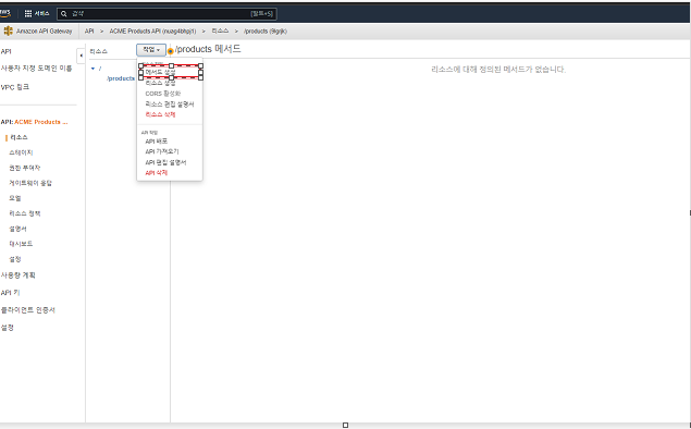 왼쪽 화면의 리소스를 누르고 ./product 리소스의 GET을 클릭 한후 메소드 요청을 클릭 합니다.