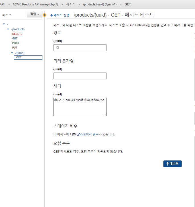 {uuid}부분에 앞에서 복사하 uuid값을 입력 후 테스트 버튼을 클릭 합니다.