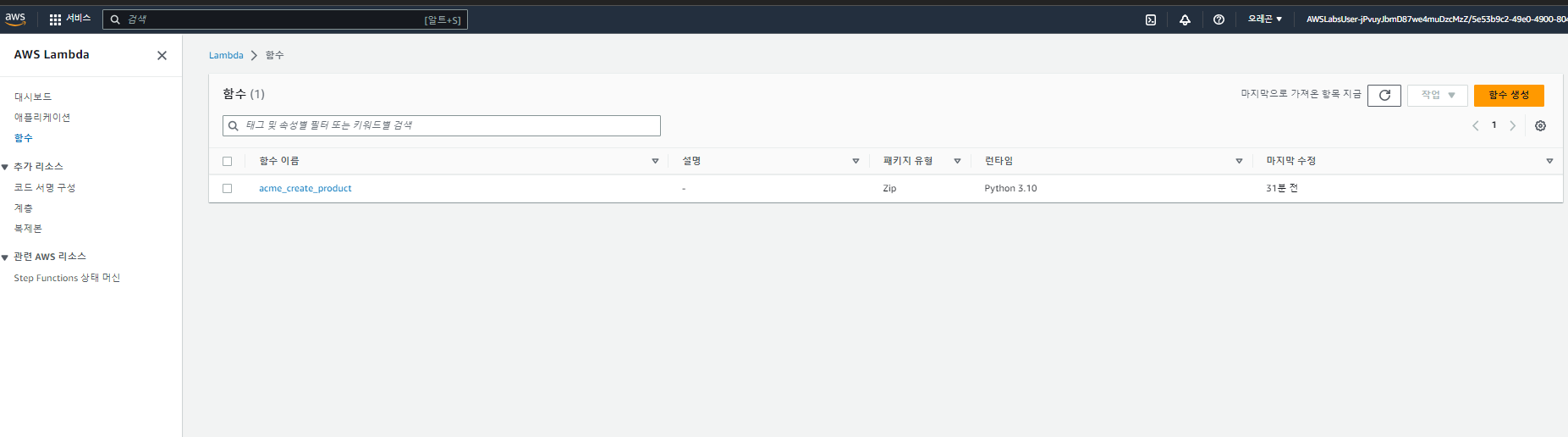우선 DynamoDB 테이블에서 제품을 생성/기록할 함수를 생성하기 위해 AWS 콘솔창에서 Lamda를 검색하고 클릭 합니다.