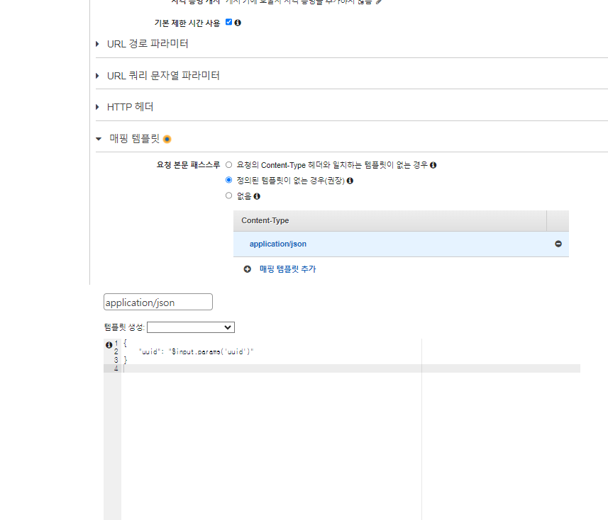 아래쪽으로 스크롤하여 Mapping Templates를 확장을 하고 정의된 텝플릿이 없는 경우를 선택 하고 매핑 템플릿 추가를 클릭 합니다.