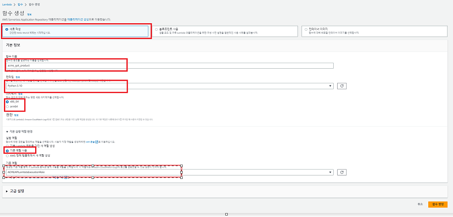 Lamda에서 함수 생성을 클릭 하고 아래의 값들을 입력 하고 함수 생성을 클릭 합니다..