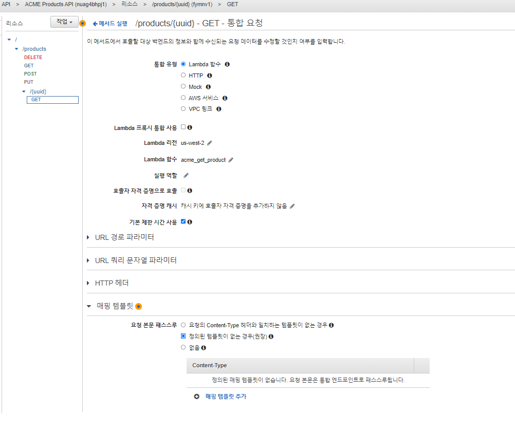 이제 경로에 포함하여 전송한 uuid가 Lambda에도 전송되도록 해야 합니다. 그러려면 통합요청을 변경해야 합니다