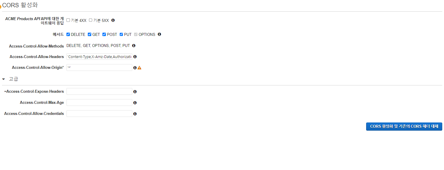 모든 항목을 그대로 두고 cors활성화 및 기존 cors 헤더 대체 버튼을 클릭 합니다.