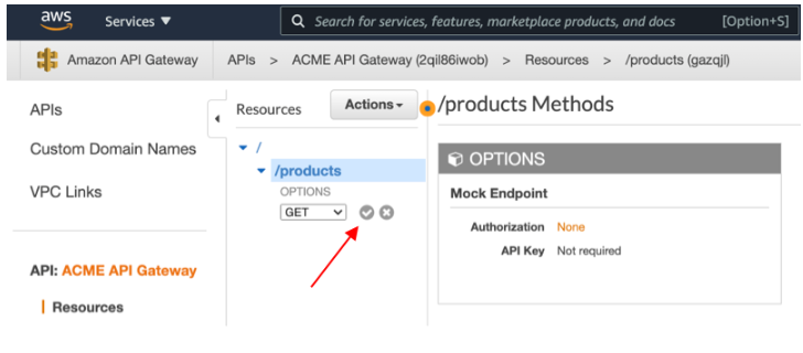 배포를 위해 API에서 ./product 리소스에서 작업 버튼을 클릭하여 CORS활성화를 클릭 합니다.