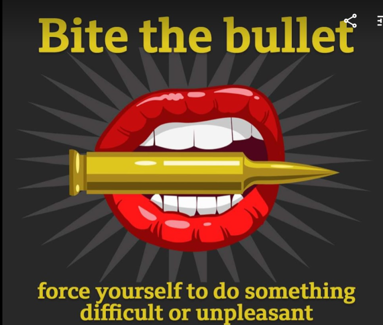 혹시 "bite the bullet"이라는 표현을 들어 보셨나요? 의미를 보면 자기 자신을 어떤 어려운일이나 즐겁지 않은걸 강요하는 상황에서 사용이 되는 표현 입니다. 굳이 우리말로 번역을해보면 " 이를 악물고 ~를 하다"라는 의미일것 같습니다. "Bite the bullet"을 직역을 하면 "총알을 물다"라는 의미 인데요. 이 관용어구의 기원은 예전에