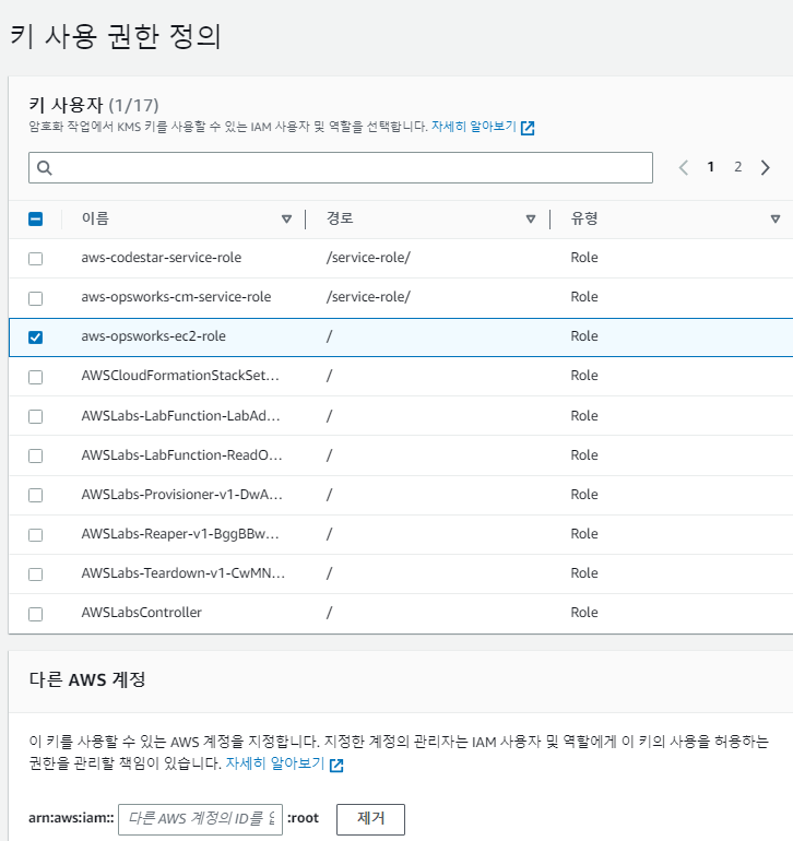 여기에는 생성한 KMS 키를 사용할 수 있는 IAM 사용자 또는 역할을 제어하는 방법이 표시됩니다. 동일한 추가 및 제거 단계를 사용하여 KMS 키를 관리할 수 있는 IAM 사용자를 제어합니다.
