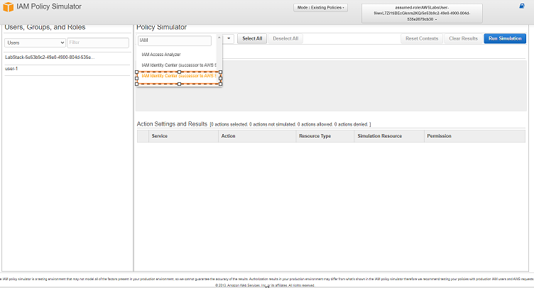 IAM 정책 시뮬레이터 페이지의 사용자, 그룹 및 역할 창에서 user-1을 선택합니다.