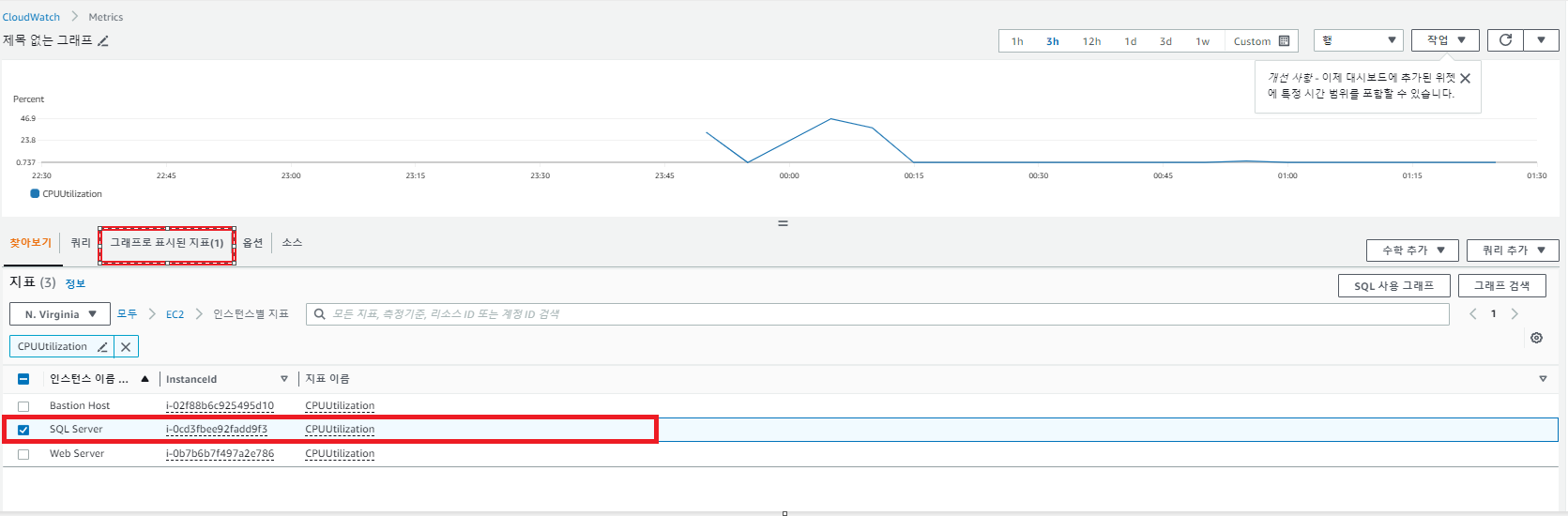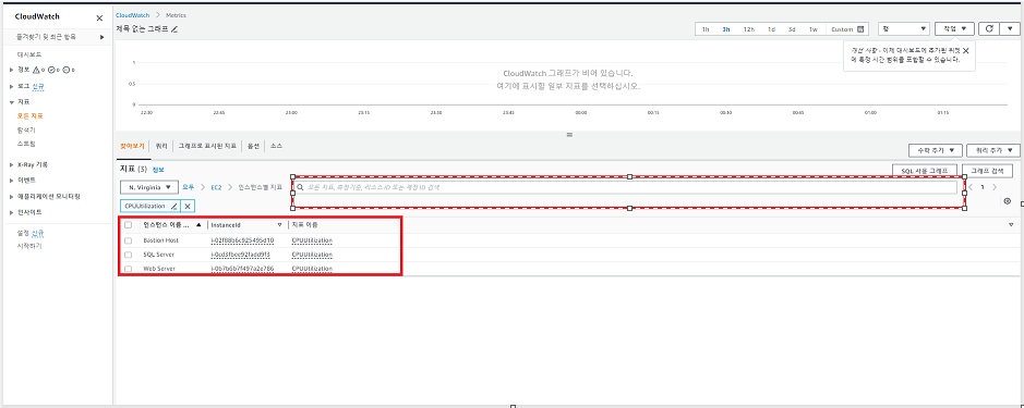 아래 그림 처럼 인스턴스별 지표를 클릭한 후 검색창에서 CPUUtilization를 입력 하고 검색을 합니다.