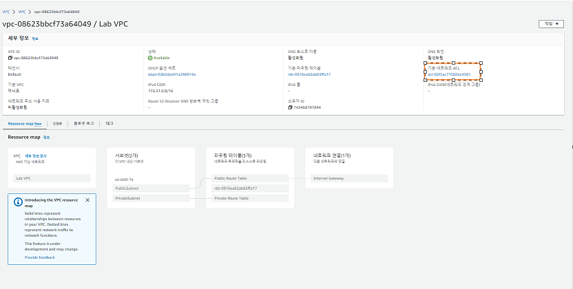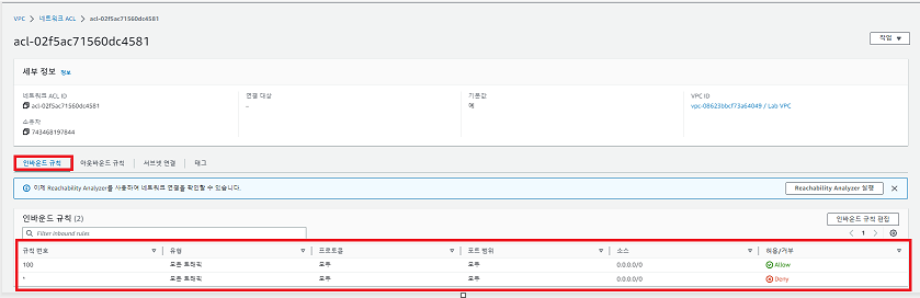 Lab VPC를 선택을 하고 세부 정보에서 기본 네트워크 ACL을 클릭 합니다.
